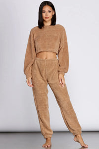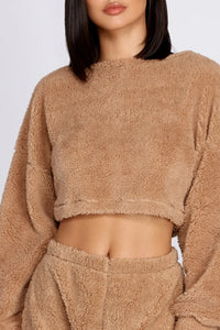 Get cozier than you ever have in some super soft pajamas! This top is designed with a round neckline, long sleeves, and a cropped hem that hits mid torso. It is composed of a sherpa material that offers a form fit and moderate stretch.