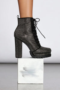 Shine in the spotlight with these diva-worthy boots! They feature a mid-calf fit, a lace up front with small metal grommets, a round toe with wide platform, a textured lug sole and a block heel. Boots are composed of a faux suede material and embellished with sparkling heat stones throughout.