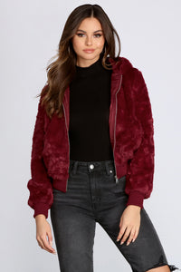 This stylishly soft faux fur bomber will for sure be your new favorite jacket. It features a hood, long sleeves, ribbed knit cuffs, a front zipper, and a ribbed knit hem. The faux fur fabric has no stretch and includes a woven lining.Style Number/Barcode: 06201-0042
