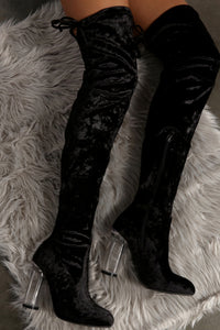 Bring on the velvet! Not only are we obsessed with a clear heel, but we are obsessed with a velvet boot! This pair is designed with an almond toe, a round clear Lucite heel, and an inner zipper. Boots have a tie detail at the top.Style Number/Barcode: 07402-0027