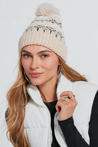 You'll look like a total cutie in this knit beanie! Featuring a furry pom top, and a fair isle pattern, and is composed of cozy knit material. Complete the look in a puffer vest for cold days!
