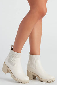 Hey, there cutie rocking these lug sole booties! They feature a round toe, chunky block heel, and rib-knit upper design on faux leather material. Complete the look in a flannel shacket for cold-weather vibes.