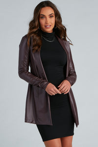 Get a chic and sophisticated look in this trendy faux leather blazer! It features a flat lapel collar, a center hook and eye front closure, long fitted sleeves, and a near mid-thigh length. Blazer is composed of a faux leather fabric with a moderate stretch. Layer this blazer over a pair of mom jeans for a casual-chic vibe.