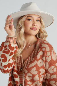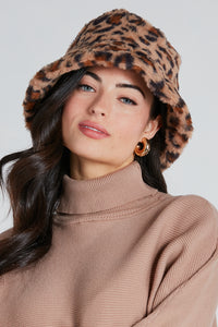 Make a bold fashion statement in this leopard faux fur bucket hat that is so of the moment. It features a classic bucket hat design with a short brim and a trendy leopard print on cozy faux fur material. Style with a long fringe scarf and ankle booties!