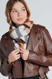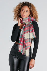 Look fabulous this season in this plaid scarf with cute frayed trim. Crafted from soft knit material, it is sure to be a favorite addition to any wardrobe and will keep you warm and stylish all season. Complete the look in a basic long sleeve top for running errands or a coffee run!