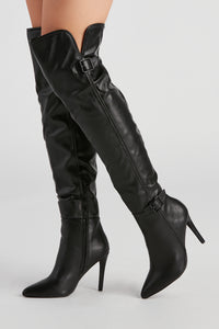Make sleek moves in these chic over-the-knee stiletto boots! They feature a pointed toe, a thin stiletto heel, dual buckle accents at the ankle and knee, and an inner zipper closure. Style with a sweater dress and hoop earrings.