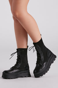 Kick it old school in these faux leather combat booties in a cool, modern style! They feature a round toe, lug platform sole, lace-up front placket, knit panels, and back pull tabs for easy slide-on/off styling. Complete the look in a distressed denim jacket.