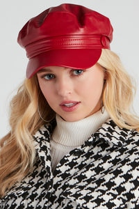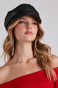 Major Chic Moves Faux Leather Cabbie Hat Major Chic Moves Faux Leather Cabbie HatMake major chic moves in this sleek faux leather cabbie hat! Featuring a traditional cabbie hat design with a short curved brim and trendy stud accents, this accessory will elevate your everyday looks. Style with a sweater dress and booties. Fit & Features - Traditional cabbie hat design