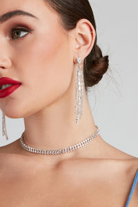 Shimmer And Shine Rhine Earrings Shimmer And Shine Rhine EarringsShimmer and shine while catching the dance floor lights! You'll be glowing in these rhinestone earrings featuring a cubic zirconia stud with cascading fringe and baguette stones. Complete the look with a dazzling beaded clutch. Fit & Features - Cubic zirconia stud