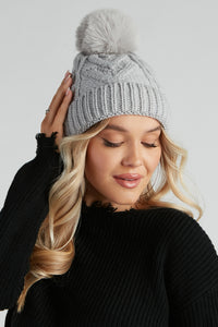 Snuggly Cute Faux Fur Pom Beanie Snuggly Cute Faux Fur Pom BeanieKeep snuggly and look cute in this faux fur pom beanie featuring a chunky cable knit design and a foldover hem. Complete the look in a trendy denim jacket and booties. Fit & Features - Faux fur pom