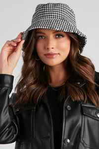 Total Aesthetic Houndstooth Bucket Hat Total Aesthetic Houndstooth Bucket HatMatch your aesthetic for the changing season in this houndstooth bucket hat! It features a classic silhouette with hints of shimmery woven lurex. Complete the look in a classic denim jacket. Fit & Features - Houndstooth pattern
