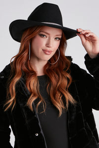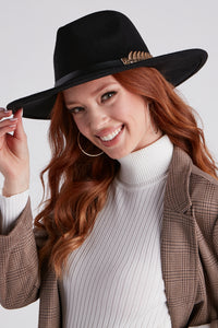 In Search Of Luxe Gold Leaf Trim Hat In Search Of Luxe Gold Leaf Trim HatYour search for luxe ends here with this faux wool hat! It features a stunning gold leaf trim on a thin faux leather band and a wide brim. Complete the look in a polished plaid blazer. Fit & Features - Gold leaf trim, thin faux leather band