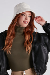 Keep Cozy Faux Sherpa Trim Bucket Hat Keep Cozy Faux Sherpa Trim Bucket HatKeep cozy and cute styling this bucket hat with your cold-weather fit! It features a faux leather exterior with a faux sherpa trim and a foldable brim. Complete the look in lug booties for a casual day out. Fit & Features - Faux leather exterior