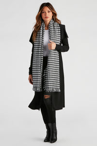 Chic Houndstooth Fringe Blanket Scarf Chic Houndstooth Fringe Blanket ScarfKeep it chic with a scarf that adds a stylish touch to your layered outfits. The scarf features a trendy houndstooth pattern, a short fringe trim, and an oversized blanket style. The scarf is composed of a soft knit fabric. Complete look with a sweater and high waist jeans. Fit & Features - Houndstooth pattern