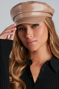 Faux Patent Leather Cabby Hat Faux Patent Leather Cabby HatGet ya cabby hat here, girl! This cabby hat features allover faux leather fabric with a flat top and short brim. The hat is composed of a faux patent leather material. Complete look with a faux fur jacket and thigh-high boots. Fit & Features - Flat top