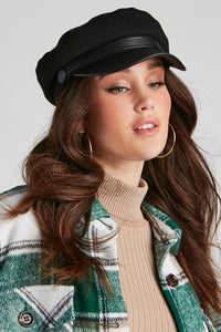 Downtown Chic Faux Leather Cabbie Hat Downtown Chic Faux Leather Cabbie HatTop off your look with this elevated cabbie hat for a downtown chic vibe. It features a traditional cabbie hat design with a flat top, an updated sleek faux leather short curved brim, and side button accents. Style with hoop earrings. Fit & Features - Flat top