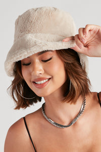 Total Trendsetter Faux Fur Bucket Hat Total Trendsetter Faux Fur Bucket HatTop off your trendsetting 'fits with this cozy faux fur bucket hat. It features a short brim and plush faux fur material. Style with hoop earrings. Fit & Features - Bucket hat design