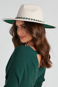 She's A Gem Fedora Hat She's A Gem Fedora HatChic and glam, this fedora hat is a total must-have. It features a structured top, a wide flat brim, a chain-link trim with emerald-colored gemstones with a mini rhinestone outline, and an emerald-hued interior. Style with a faux leather handbag. Fit & Features - Structured top