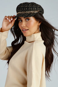 Elevated Glam Cabby Hat Elevated Glam Cabby HatBring elevated glam vibes to your look with this chic cabby hat! It features a traditional cabby hat design with a short brim and a sleek chain-link detail. The tweed material has a stylish metallic thread woven throughout. Pair this hat with hoop earrings. Fit & Features - Traditional cabby hat design