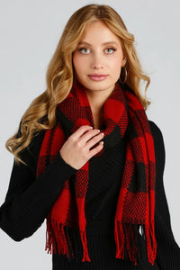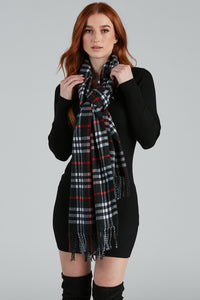 Stylish In Plaid Fringe Scarf Stylish In Plaid Fringe ScarfThis buffalo plaid scarf is the perfect outfit topper. It features a fringe trim and a soft-fuzzy knit fabric. Layer over a jacket for the perfect winter outfit. Fit & Features - Buffalo plaid pattern