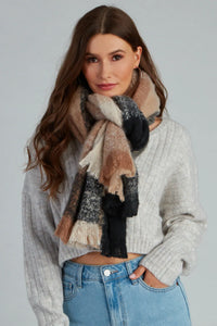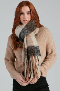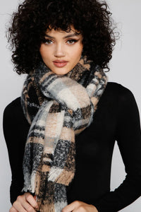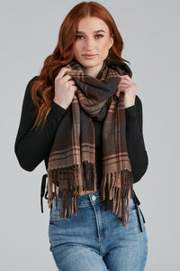 Wrapped In Cozy Feels Plaid Scarf Wrapped In Cozy Feels Plaid ScarfWrap yourself in a cozy scarf that is perfect to layer over your jackets this season! The scarf features a plaid print, an oversized fit, and a noodle fringe hem. Fit & Features - Plaid print