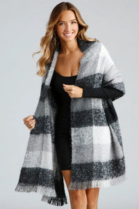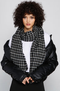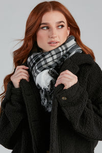 Effortlessly Chic Plaid Scarf Effortlessly Chic Plaid ScarfStep up your style with this effortlessly chic plaid scarf! It features neutral black and white hues, a classic plaid pattern, and frayed edges. Layer this scarf with a faux leather jacket and complete the look with booties. Fit & Features - Black and white hues