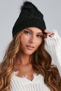 Sweet Sparkle Rhinestone Knit Beanie Sweet Sparkle Rhinestone Knit BeanieAdd sweet sparkle in this rhinestone beanie featuring a faux fur pom, diamond knit design, and sherpa lining for extra warmth. Fit & Features - Faux fur pom