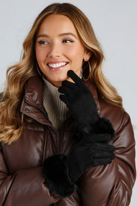 Winter Diva Faux Fur Cuff Gloves Winter Diva Faux Fur Cuff GlovesUnleash your diva side in these faux fur cuff gloves this winter! They feature a faux suede exterior and textured fingertips and a plush lining. Complete the look in a puffer coat and boots. Fit & Features - Faux fur cuffs