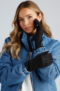 Cozy Elegance Soft Knit Gloves Cozy Elegance Soft Knit GlovesKeep warm with elegant gloves that go with all your cold-weather outfits. The gloves are composed of a cashmere-like knit material and feature a row of four studded buttons at the outer cuff. Complete look with a faux fur jacket. Fit & Features - Soft cashmere-like knit