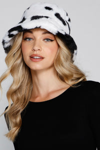 Top off your trendsetting look with this of-the-moment bucket hat! It features a traditional bucket hat design with a short brim and a soft faux fur material with an all-over cow print. Style this hat with a basic bodysuit and denim.
