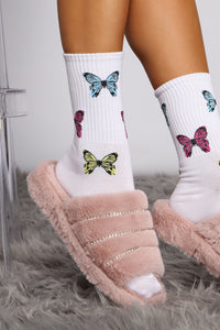 Keep it fluttery in butterfly socks that bring the charm. The pack features two pairs of crew socks that feature a multicolored butterfly design. Complete look with fuzzy slides.