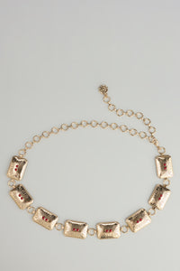 Keep your look chic and stunning with this gorgeous embellished belt. It features a thick chain-link front design with mini rhinestone embellishment and a back adjustable chain with a lobster clasp closure. Style this belt over a bodycon dress with a sparkly clutch.