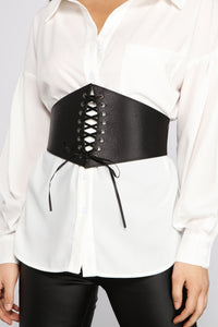 Get that cinched look with a corset belt that adds that stylish touch to your fit'. The belt features a trendy lace-up front with small metal grommets, a stretchy elastic back, and dual snap button closure. The belt is composed of a faux leather material with the front having a satin-like finish. Pair this belt over a bodycon dress and accessorize with strappy heels.