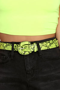 Two things that are trendier than ever right now, neon and snake print! You can have them both with this belt. Featuring a round tongue, a D shape pin buckle closure and a faux leather textured material, this belt is a go to for pop of color.