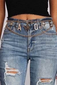 Make a statement with this chain link belt. It features two rows of chain links showcasing the script "L'amore". Includes an adjustable lobster clasp closure.