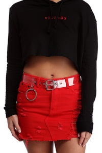 Lace up to get that waist snatched girl! This mini corset features a lace up design with gold metal grommets and an textured elastic waistband with a three button snap closure. Corset is composed of a faux suede material.