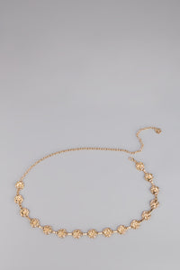 Accessorize your OOTD in this western chain belt to be the only cutie out west! This stylish belt features a beautifully etched design and an adjustable chain with a lobster closure. Complete the look with a cowboy hat.