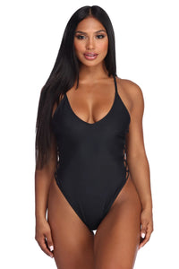 Have a sleek and strappy look with this sultry swimsuit! The black one piece features a plunging neckline with a criss cross front detail, thin adjustable straps that lead to a straight across back, and a partial coverage bottom.RETURNS ACCEPTED ONLY WHEN ALL TAGS AND HYGIENIC PROTECTION ARE INTACT.