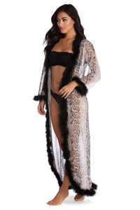 Be a little extra tonight. This long mesh robe features a snake print, a black faux feather trim, long sleeves and an open front. The garment is composed of a sheer mesh fabric that offers a relaxed fit with a moderate stretch.Model is 5'7" with a 34" bust, 24" waist and 36" hips. She is wearing a size small.