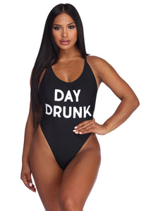 Sun's out, drinks up! This graphic black swimsuit says it all with a plunging neckline, thin shoulder straps, a plunging matching back and a high cut with partial coverage bottom. The graphic reads: "Day Drunk" in a contrasting white print.Model is 5'6" with a 34" bust, 26" waist and 38" hips. Bra Size: 34D. She is wearing a size small.