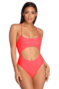 Take a bold plunge into style in this vibrant swimsuit! It features a neon orange hue, a scoop neckline, a mid-drift cut out and narrow shoulder straps that lead to an open back with lattice straps. Includes a full coverage bottom.RETURNS ACCEPTED ONLY WHEN ALL TAGS AND HYGIENIC PROTECTION ARE INTACT.