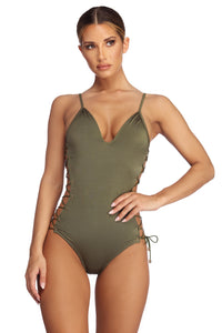 Get all laced up in this sexy olive green one piece swimsuit! It features adjustable spaghetti straps, a plunging V neckline, a low scoop back, lattice lace up sides with gold grommet details, and a partially covered bottom.Model is 5'6" with a 34" bust, 24" waist and 37" hips. She is wearing a size small.