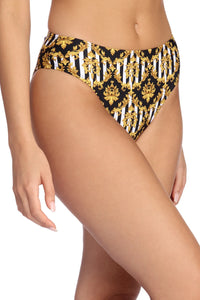 Poolside chic. This swim bottom features a high waist, cheeky bum, and a designer inspired black and gold filigree print. Don't forget the matching swim top!Model is 5'7" with a 34" bust, 24" waist and 36" hips. She is wearing a size small.
