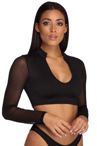 More mesh, the better! This black swim top features a plunging V neckline with pop up collar, unlined long mesh sleeves and a cropped hem. Be sure to pick up the matching bottoms to complete your pool ready look!Model is 5'7" with a 34" bust, 24" waist and 36" hips. She is wearing a size small.