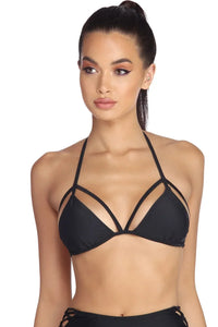 Get locked in for this sizzling look! This swim top features triangle shaped cups, removable padding, a caged design, neck ties and a back tie accent. Be sure to pick up the matching bottoms to complete your look!Model is 5'7" with a 34" bust, 24" waist and 36" hips. She is wearing a size small.