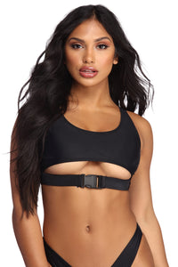 Secure your goods in this Safety First Swim Top! It features a basic tank design with a buckle under-bust detail. Includes removable padded cups. Don't forget the matching bottoms to secure your sexy swim look!Model is 5'6" with a 34" bust, 26.5" waist and 38" hips. Bra Size: 32D. She is wearing a size small.