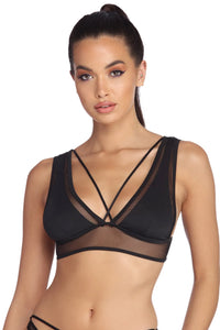 Promise yourself to keep it trendy this season in this pretty swim top! It features a black hue, a plunging V neck with an unlined mesh under bust accent, narrow criss-cross straps across the front, and a sheer mesh strap back. Be sure to pick up the matching bottoms to complete your look!Model is 5'7" with a 34" bust, 24" waist and 36" hips. She is wearing a size small.