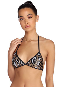 Show that wild side, pool side. This black swim top features triangle cups with removable padded cups, a sequin leopard print and traditional string ties. Don't forget the matching swim bottoms!Model is 5'7" with a 34" bust, 24" waist and 36" hips. She is wearing a size small.