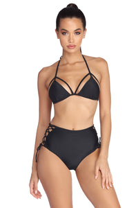 Get locked in for this sizzling look! These black swim bottoms feature a high rise waist, lace up side accents and a brief cut with cheeky bottom. Be sure to pick up the matching swim top to complete your look!Model is 5'7" with a 34" bust, 24" waist and 36" hips. She is wearing a size small.
