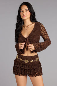 Meet your new obsession—the lace tie-front top that balances sultry and sweet. Its sheer velvet lace and flirty tie-front design make it a total vibe for date nights or festival 'fits.